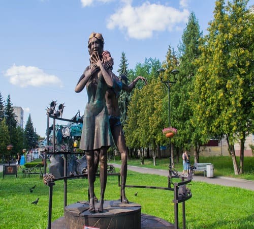 - Карусель “Дитячі пустощі” – нагорі композиції крилаті хлопчик та дівчинка тримаються за яблуко.
